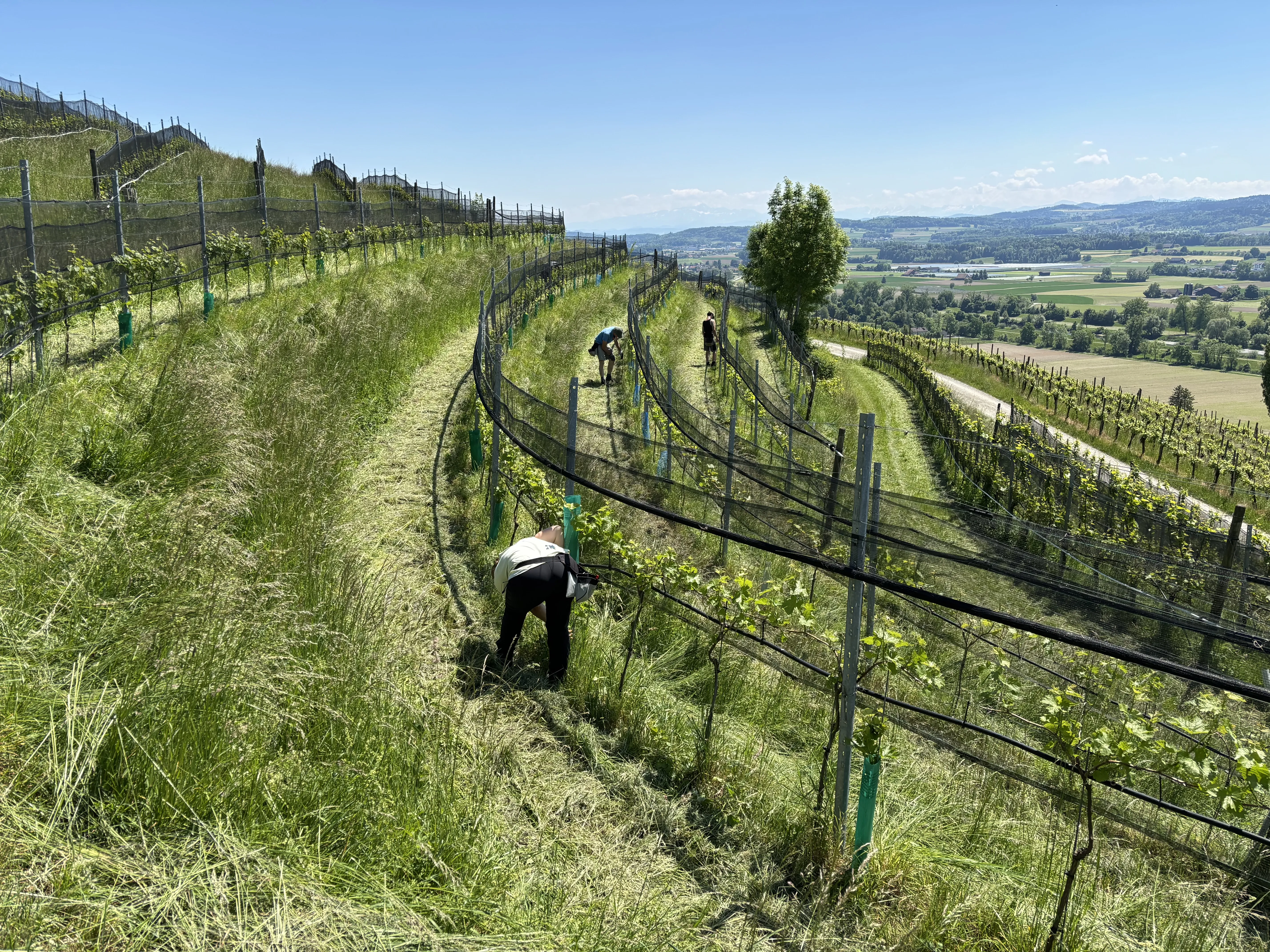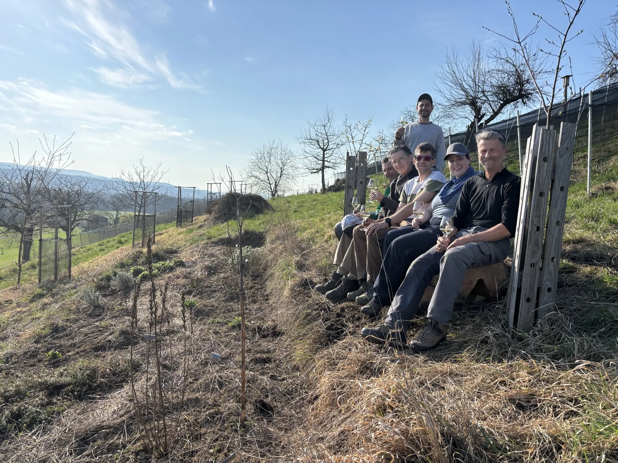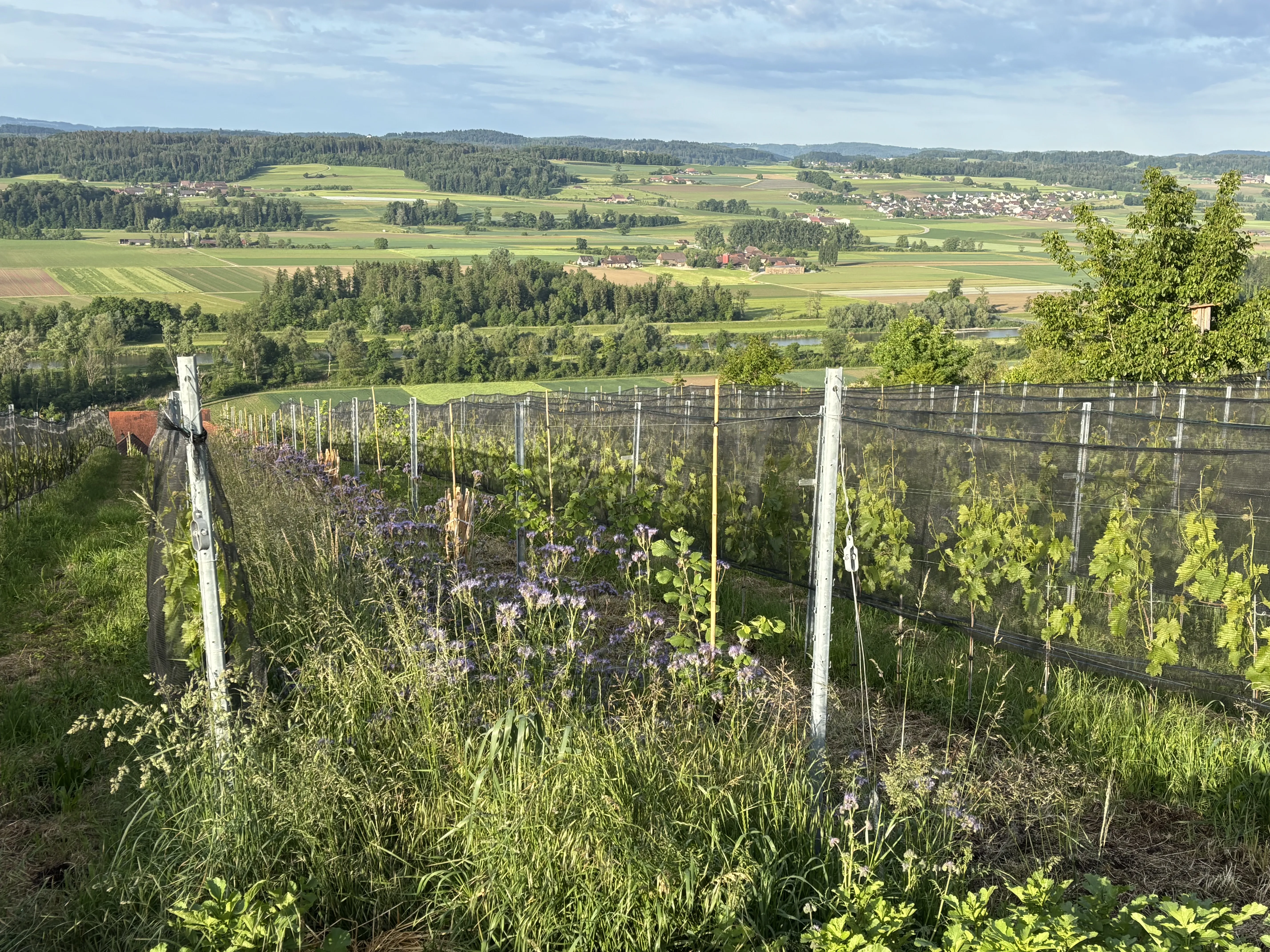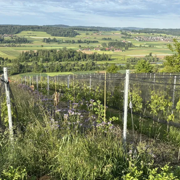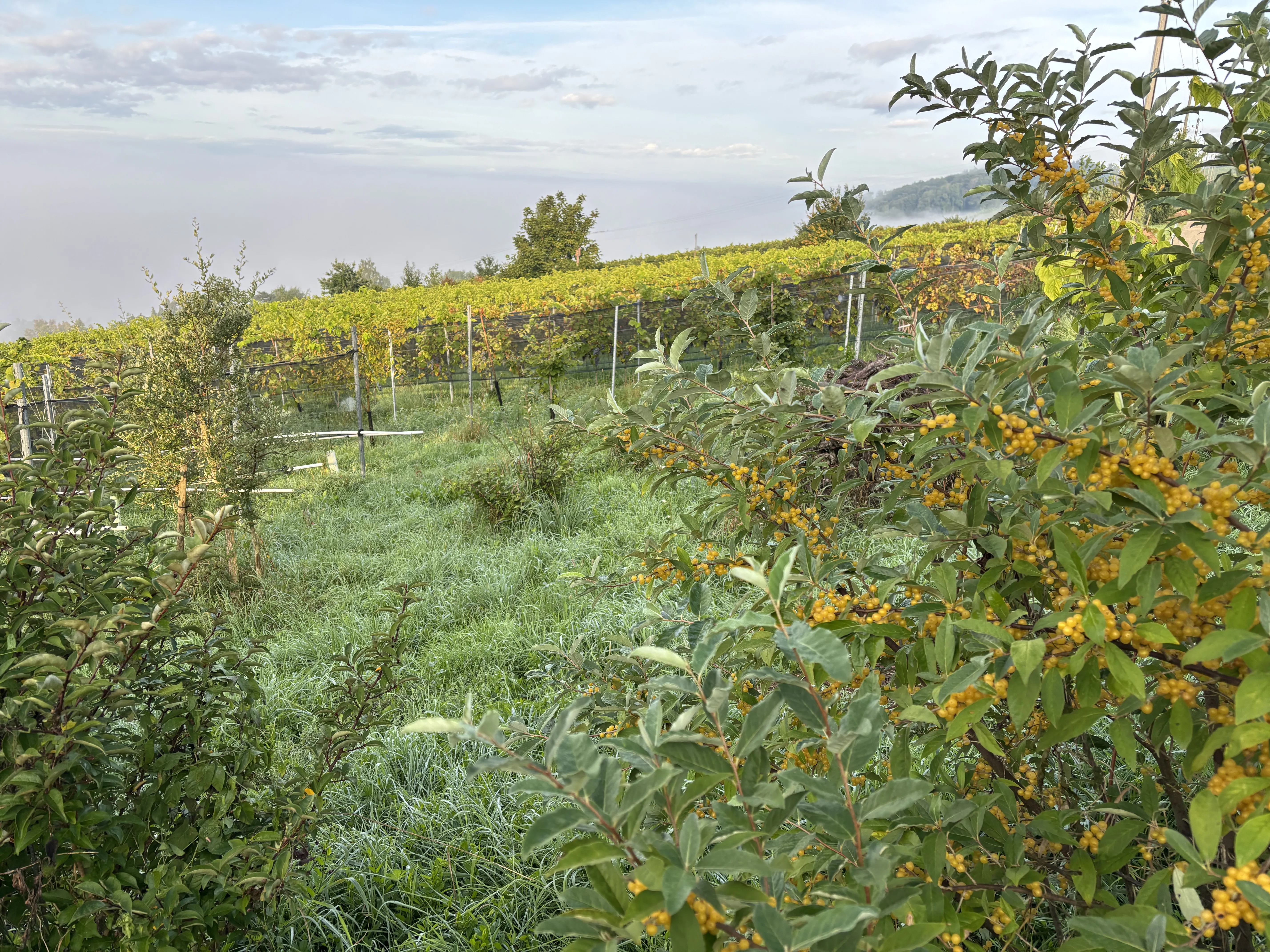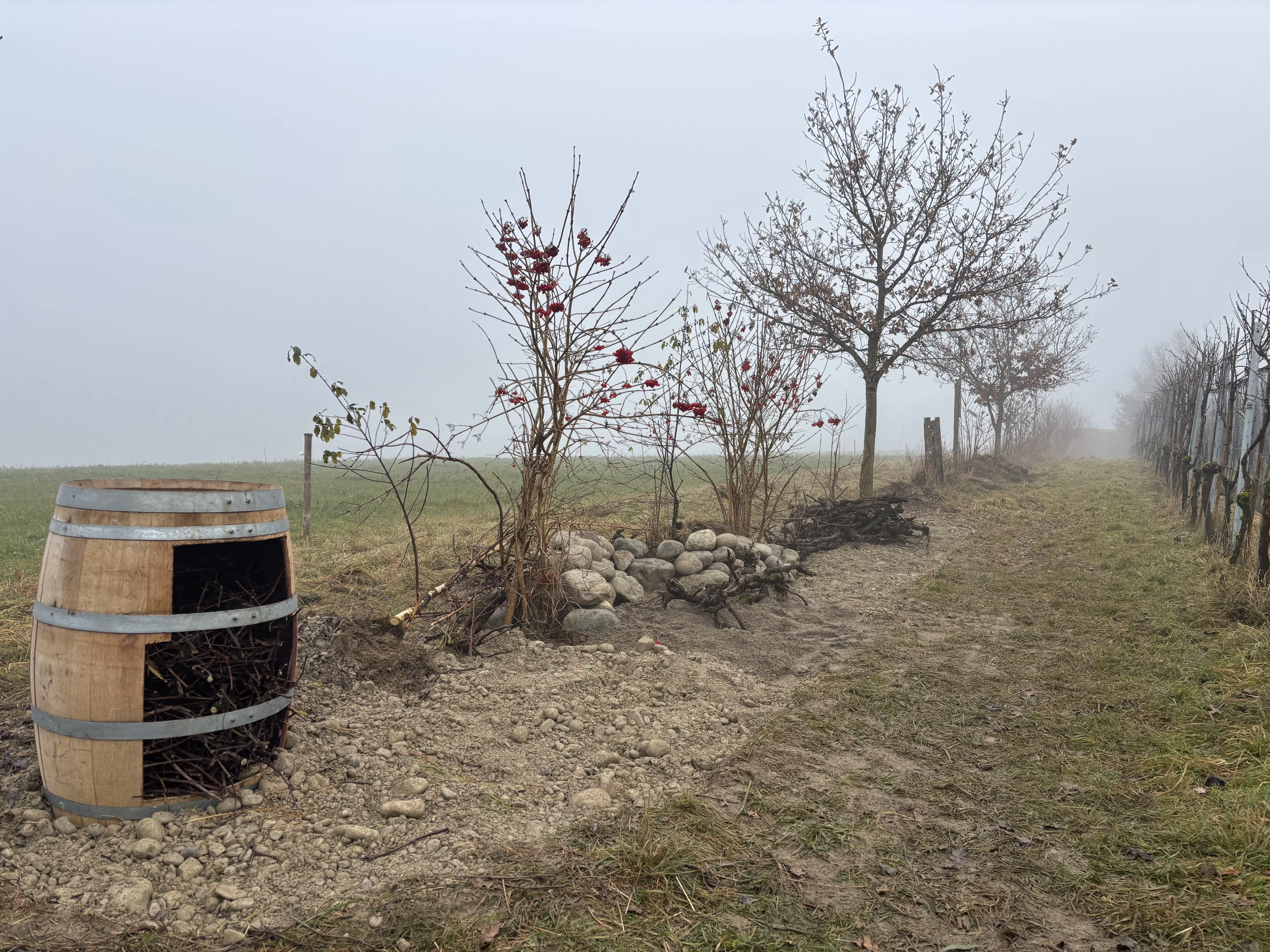 Als biologisch dynamisch funktionierendes Weingut sind wir selber ein kleiner Mikrokosmos geworden mit einem ganz eigenen Mikrobiom: Milliarden von Bodenlebewesen, Pilzen und Bakterien halten unsere Böden gesund und fruchtbar. Dank der renaturierten und gut vernetzten Biodiversität, kombiniert mit dem Ausbau unserer Mischkulturen, leben zig Millionen Insekten mit uns. Diese garantieren uns eine optimale Balance zwischen möglichen Schadinsekten und Nutzinsekten. Zugleich ermöglichen sie das Überleben von vielen anderen Tieren, die mithelfen unsere Ressourcen zu schonen: Fledermäuse, Mauswiesel, Eidechsen und Ringelnattern, Vögel oder andere grössere Wildtiere. Sie alle helfen entscheidend mit, unsere internen Lebenskreisläufe zu stärken und gesund zu halten. Und wir als Team von 11 motivierten Menschen versuchen begleitend, diese Lebensgrundlagen für alle "Mitarbeiter" mitzugestalten und sicher zu stellen. Dazu gehört die ausgewogene Biodiversitätspflege genauso wie der angepasste Rebschnitt, das Herstellen und Ausbringen des eigenen Kompost oder Pflanzenstärkungsmitteln, die individuellen Pflegemassnahmen während der Vegetationsphase, das Ernten der verschiedenen Trauben- Früchte- Nüsse- und Getreide, oder das schonende Vinifizieren unserer Charakterweine.