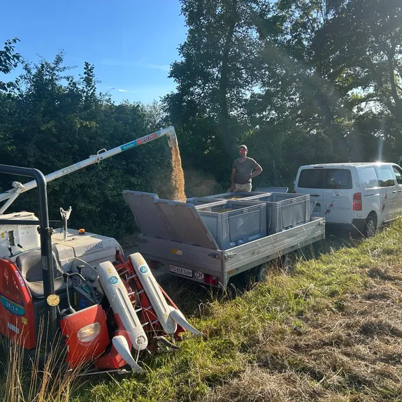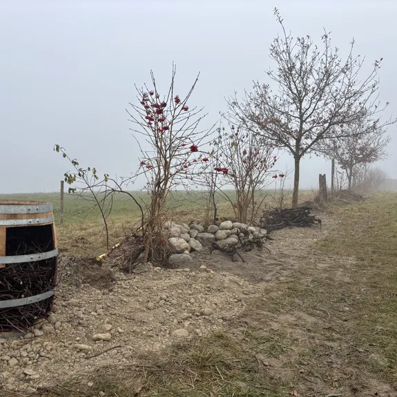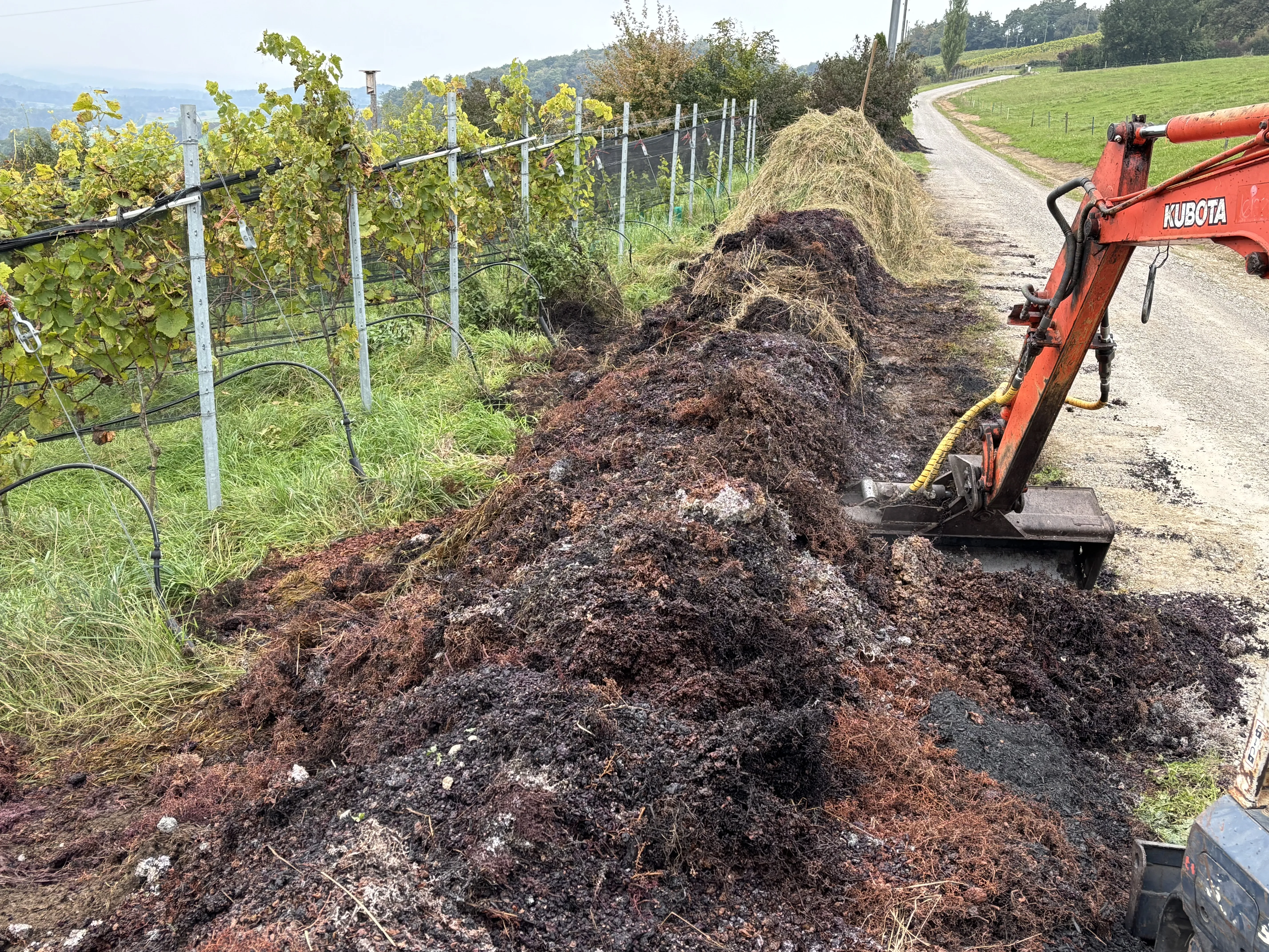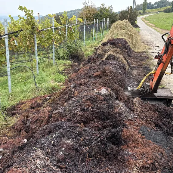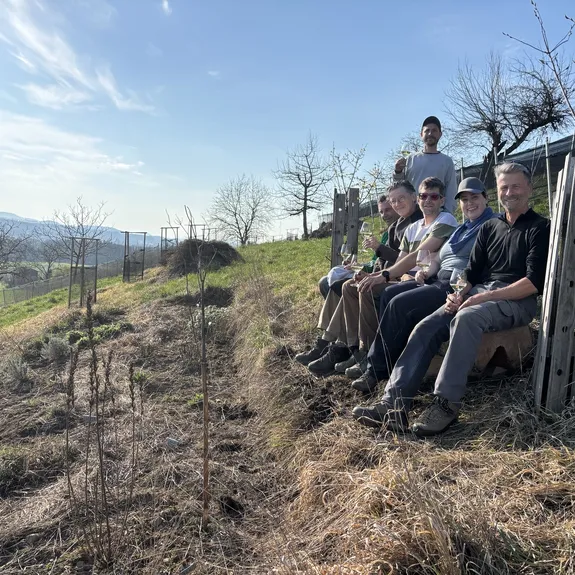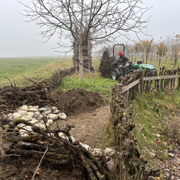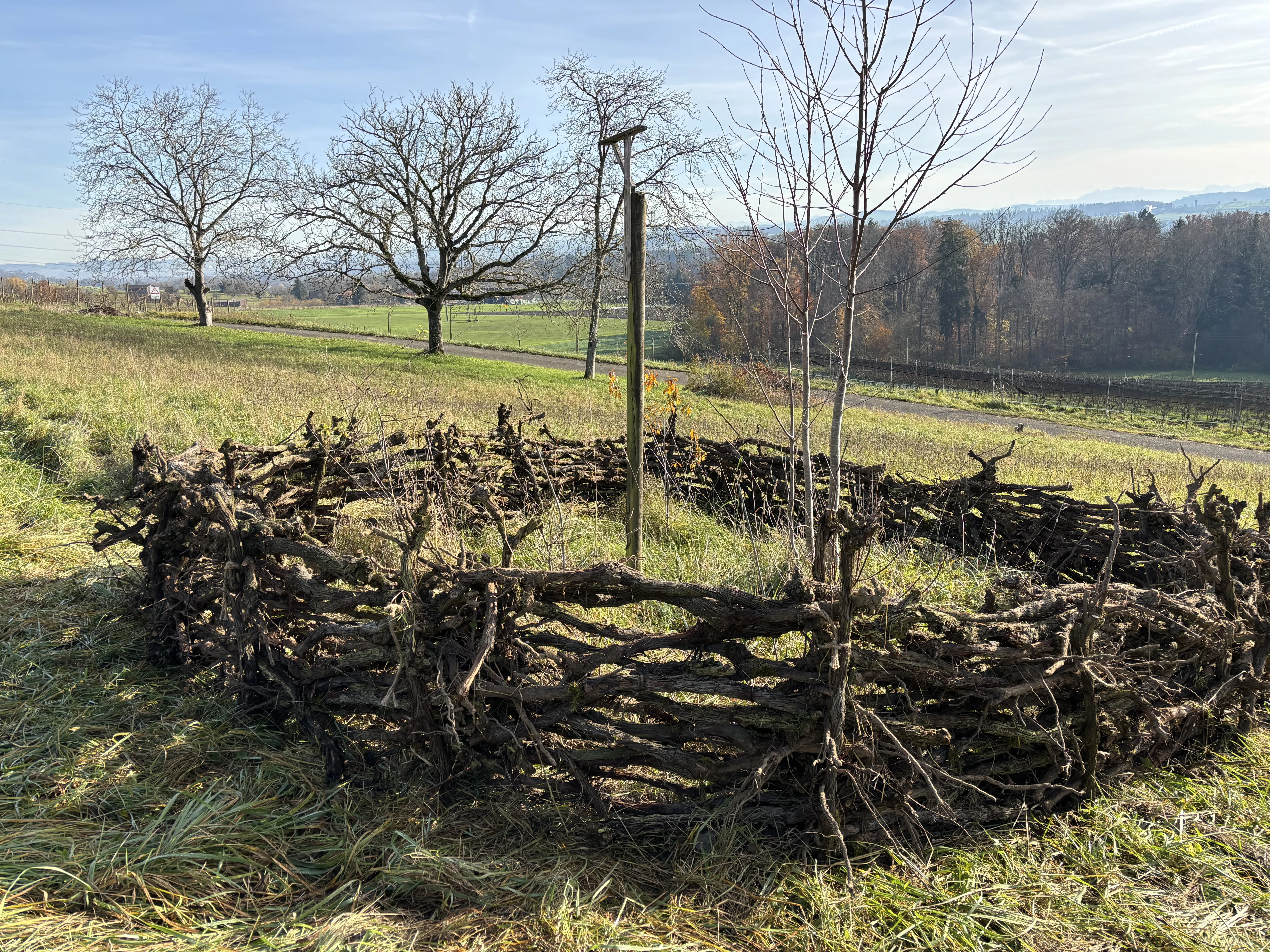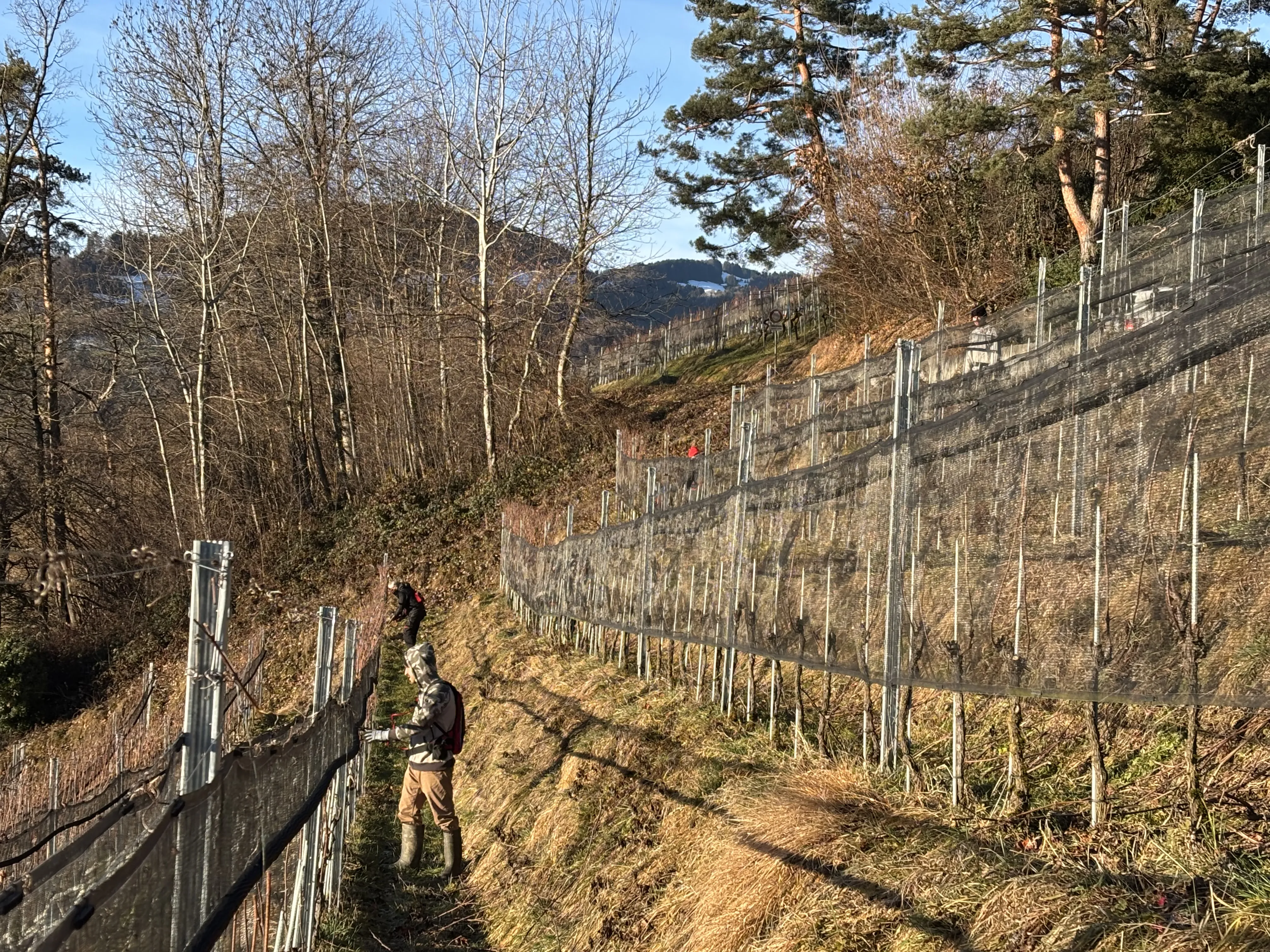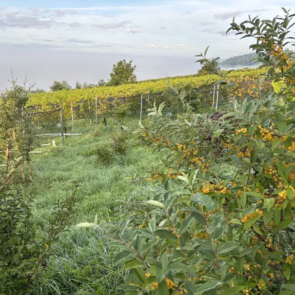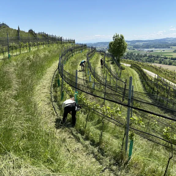 Als biologisch dynamisch funktionierendes Weingut sind wir selber ein kleiner Mikrokosmos geworden mit einem ganz eigenen Mikrobiom: Milliarden von Bodenlebewesen, Pilzen und Bakterien halten unsere Böden gesund und fruchtbar. Dank der renaturierten und gut vernetzten Biodiversität, kombiniert mit dem Ausbau unserer Mischkulturen, leben zig Millionen Insekten mit uns. Diese garantieren uns eine optimale Balance zwischen möglichen Schadinsekten und Nutzinsekten. Zugleich ermöglichen sie das Überleben von vielen anderen Tieren, die mithelfen unsere Ressourcen zu schonen: Fledermäuse, Mauswiesel, Eidechsen und Ringelnattern, Vögel oder andere grössere Wildtiere. Sie alle helfen entscheidend mit, unsere internen Lebenskreisläufe zu stärken und gesund zu halten. Und wir als Team von 11 motivierten Menschen versuchen begleitend, diese Lebensgrundlagen für alle "Mitarbeiter" mitzugestalten und sicher zu stellen. Dazu gehört die ausgewogene Biodiversitätspflege genauso wie der angepasste Rebschnitt, das Herstellen und Ausbringen des eigenen Kompost oder Pflanzenstärkungsmitteln, die individuellen Pflegemassnahmen während der Vegetationsphase, das Ernten der verschiedenen Trauben- Früchte- Nüsse- und Getreide, oder das schonende Vinifizieren unserer Charakterweine.