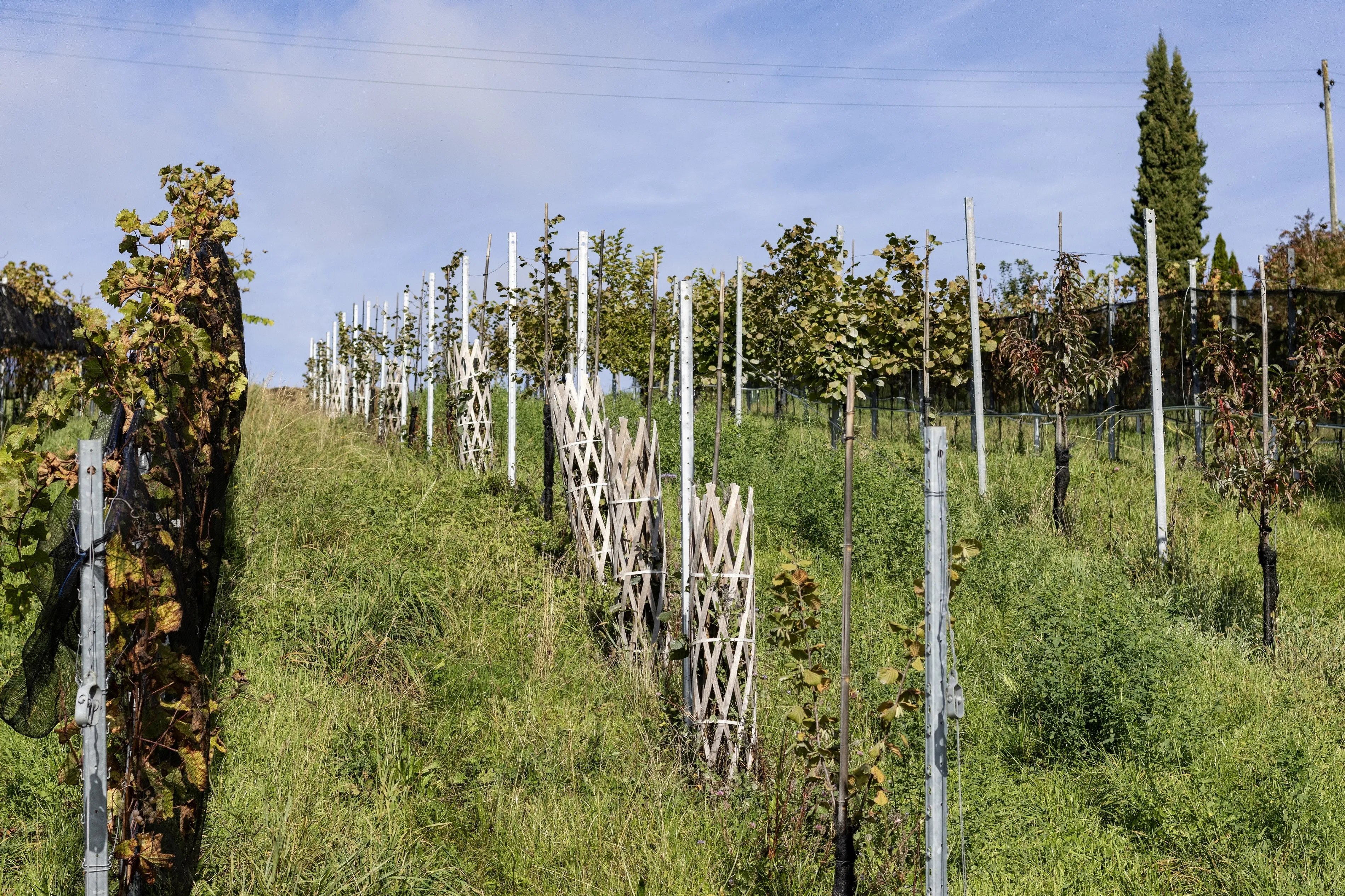 Haselnuss, Granatapfel, Kaki, Maulbeerbäume, Dinkel, Hafer oder Buchweizen bilden zusammen mit Wildkräutern wie Brennnessel, Ringelblume, Schachtelhalm oder Beinwell ein lebendiges Netzwerk aus Reben, Bäumen und Ackerpflanzen. Permakultur bedeutet für uns: nicht nur anbauen, sondern zusammenwachsen lassen. So entstehen Weingärten als kleine, stabile Ökosysteme.